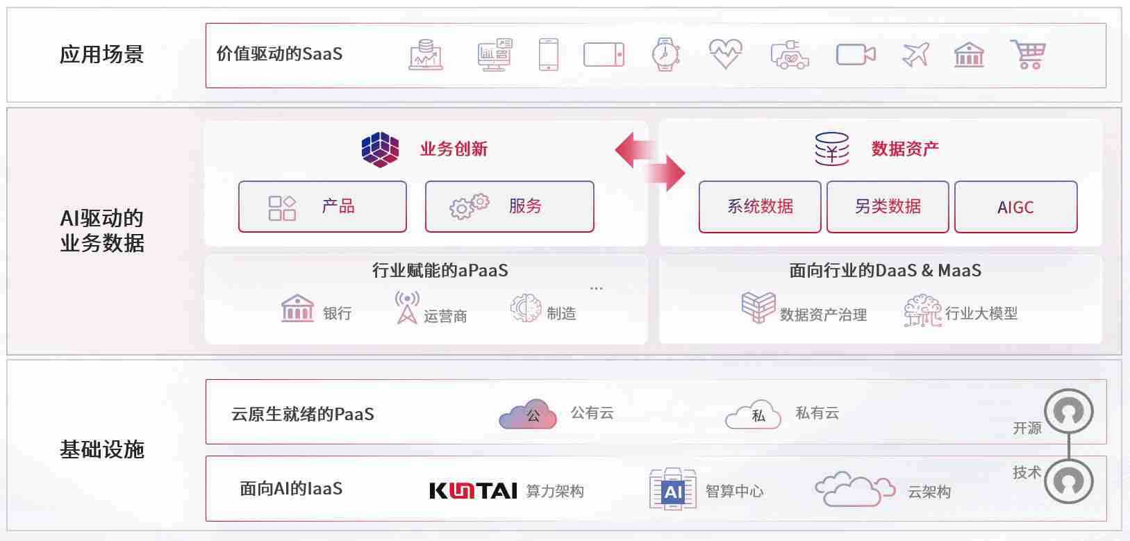 数字时代,,围绕企业数字化转型的关键要素,,开云电子数码开创性的提出数云融合战略和技术体系框架,,,着力在云原生、、、、数字原生、、、AI原生和信创产业上架构产品和服务能力,,,为处在不同数字化转型阶段的快消零售、、、、汽车、、金融、、、、医疗、、、政企、、教育、、、、运营商等行业客户提供泛在的敏捷IT能力和融合的数据驱动能力,,,,构建跨界融合创新的数字业务场景和新业务模式,,,助力企业级客户建立面向未来的核心能力和竞争优势,,,全面推动社会的数字化、、、、智能化转型升级。。。