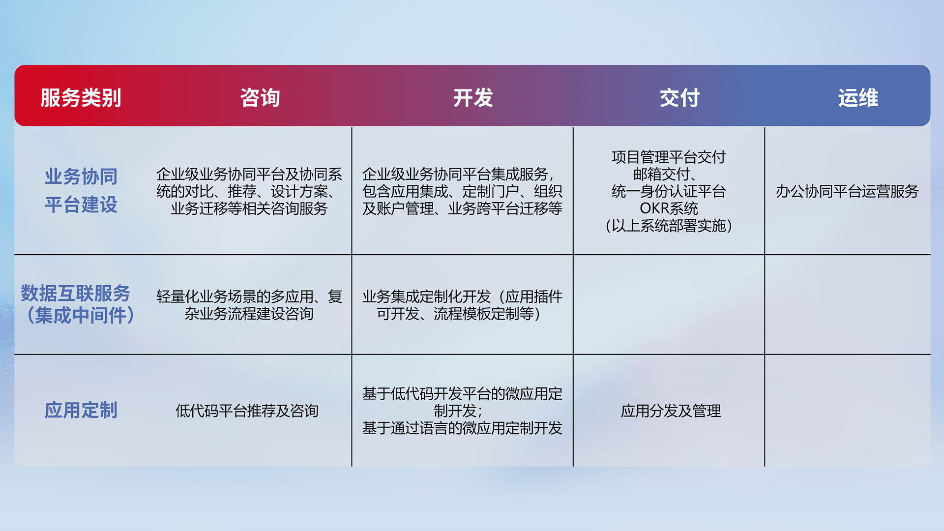 针对钉钉、、、、企微、、IDaas等平台级产品提供产品的规划、、、、方案、、、交付、、、定制化开发等服务,,实现如统一协同办公、、智能客户服务、、、、混合会议管理、、、、智能数据查询、、、、等业务场景,,实现数字化转型。。
