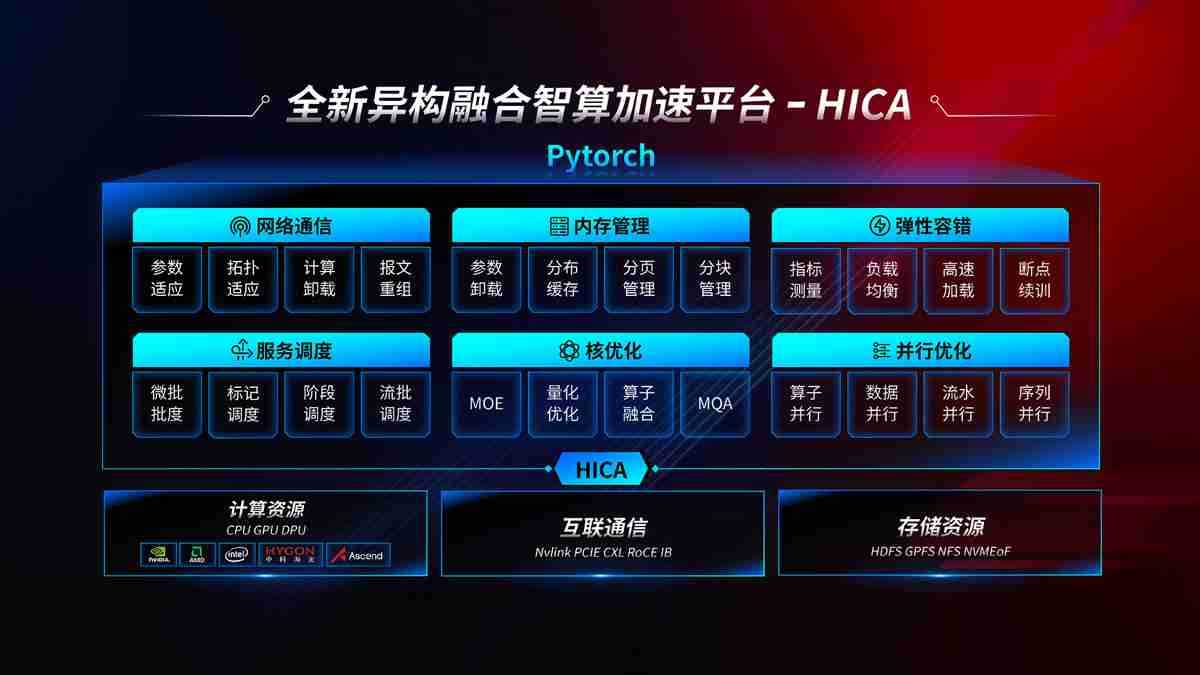 通过自研的服务层、、、中间适配层、、、以及调度编排算法,,采用数据并行、、、、模型并行等多种并行方式,,把并行计算任务进行有效的分解,,,使其分别由相应的软件栈和算力资源来承接。。。。当GPU资源变化,,,,HICA可以实时动态调度计算子任务并调整模型拓扑和架构,,,以充分聚合各种算力资源。。。