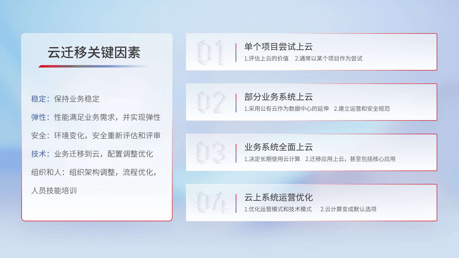 结合实际业务,,,,从规划设计、、、云平台选型、、、云原生改造、、数据迁移、、、集成交付,,迁移全过程为客户识别最佳上云路径,,,做好风险识别管理,,,设计网络架构、、、身份权限、、、安全审计合规、、操作审计、、、日志审计、、、、监控告警策略、、多站点容灾设计等,,对云上基础设施进行整体规划,,,,提升IT治理水平,,,,以满足弹性、、、、高可用、、、高性能的需求。。