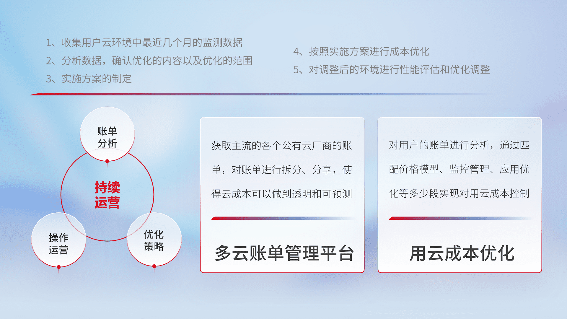 通过灵活运用多种自动化迁移工具,,,,帮助企业用户实现业务和数据高效 、、、稳定的上云迁移和云上迁移,,,,采用自研多云纳管平台,,以中立管理模式,,,,解决多组织、、、、多云、、、多运维厂商的复杂关系的管理,,,,保证多云平台资源配置的一致性,,,实时掌控云资源运行数据,,,运用智能化工具分析云资源多云平台的管理服务,,,透明化管理成本支出,,,用云成本可预测、、用云费用可优化、、、、云资源配额有据可依。。