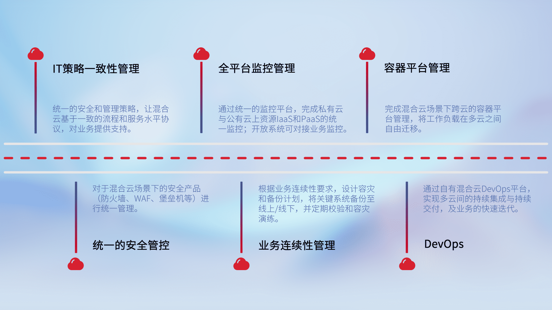 通过多云纳管,,,,以统一的资源数据模型把客户的云资源进行抽象和封装,,,进而实现对多云资源的统一操作,,,,保障云资源管理的可靠性、、、稳定性与可用性。。。。量身定制化运维内容,,,,配置、、、、开发运维、、、补丁管理、、备份、、、、监控、、、认证和访问管理、、、审计和日常巡检等,,保障在用云过程中的可靠度,,,,稳定度以及高可用率。。。。